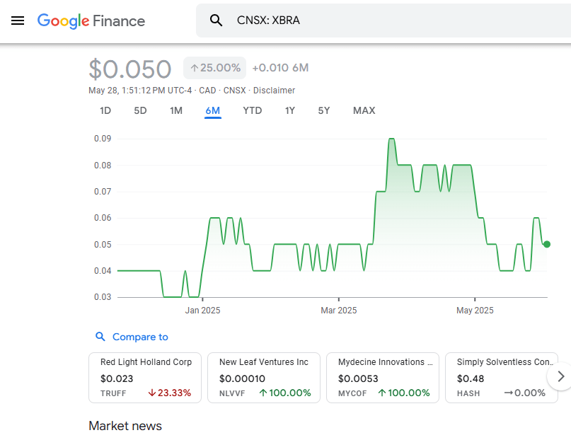 Having the temporal chart works wonders for this time series graph which can be adjusted across a series of date ranges. The cool thing about XBRA is that they have a license in Mexico that allows for seeding and cultivation of CBD, which they use as a commercial health product. It can be interesting to go to a companys webpage and learn more about their brand and what is new and relevant. A lot of times, a stock price will move on earnings calls and anticipated news, or other releases that ofter coincide with the momentum of the business.